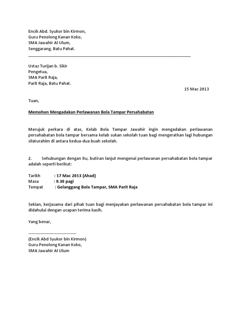 Contoh Surat Jemputan Perlawanan Persahabatan Bola Sepak Jabatan